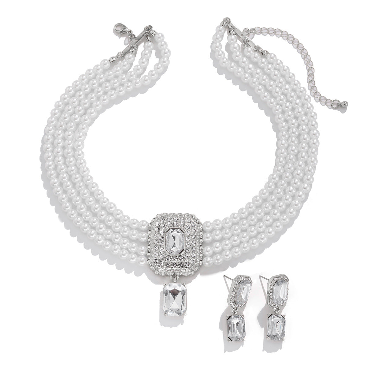 Fashionable imitation pearl necklace set, light luxury geometric alloy multi-layer clavicle chain